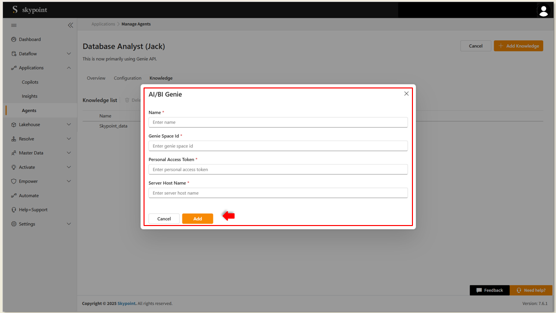 - Enter the Genie Space ID, Personal Access Token, and Server Host Name in the provided fields.
