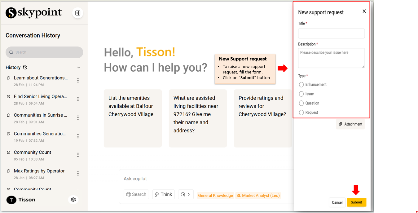 B. Log in to Skypoint AI Copilot to raise a support request: