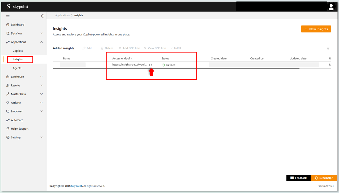 Once fulfilled, the Access Endpoint for the Insight application will be activated
