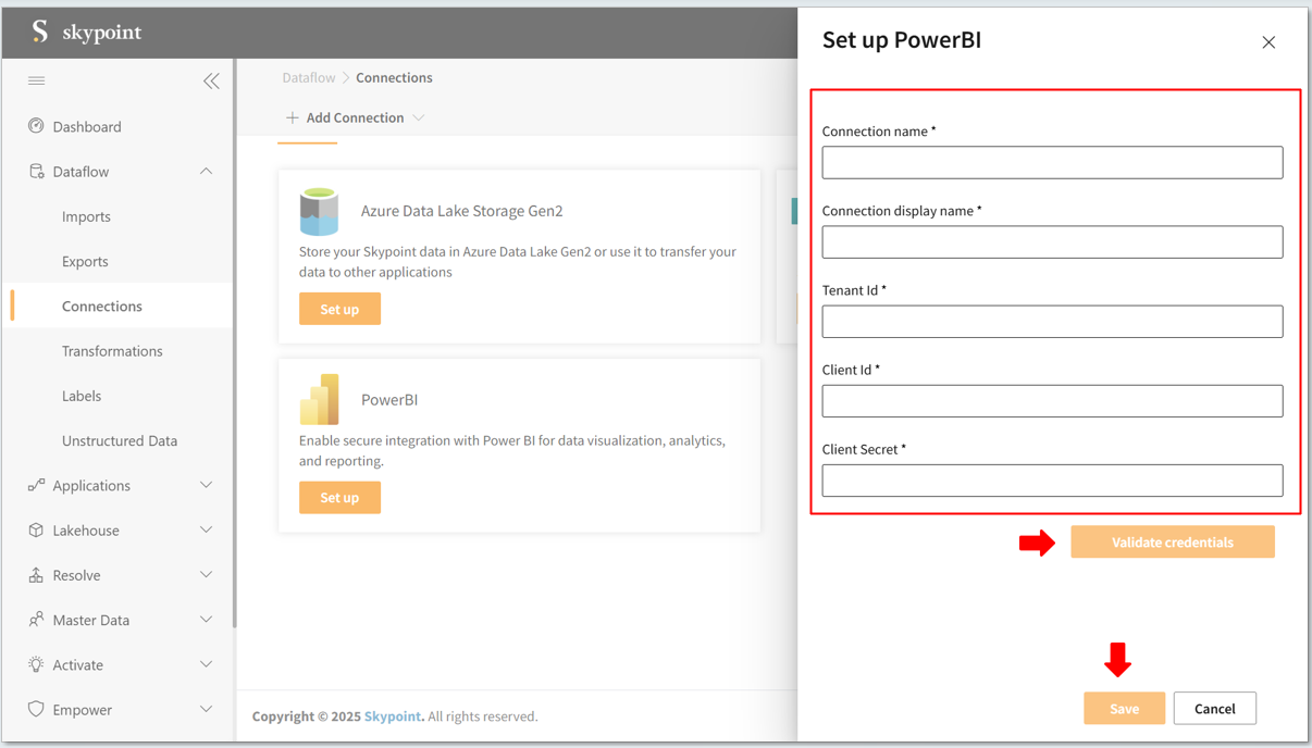 - Fill in the required connection details and validate credentials.