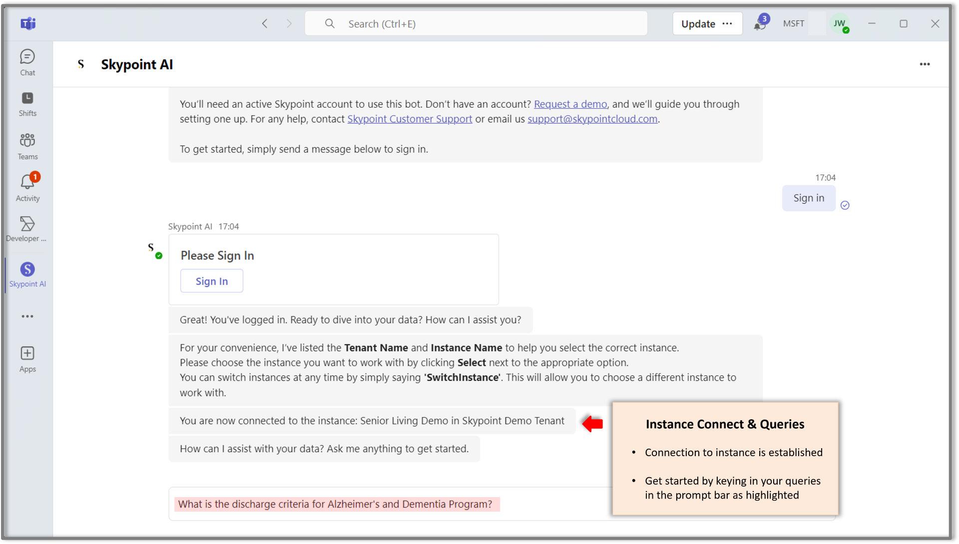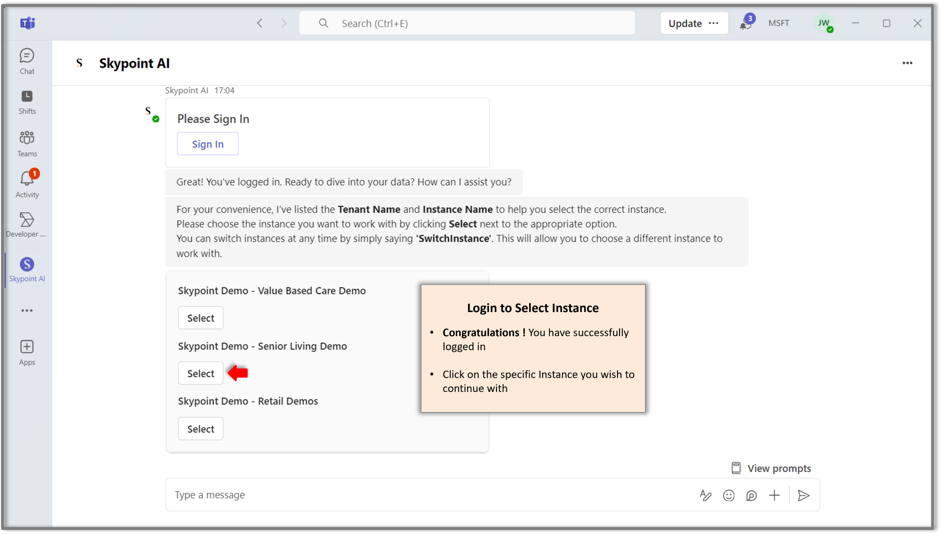 Start Using Skypoint AI Teams Bot: After signing in, you can begin interacting with the Skypoint AI Teams Bot in Teams by selecting the desired instance to get started.